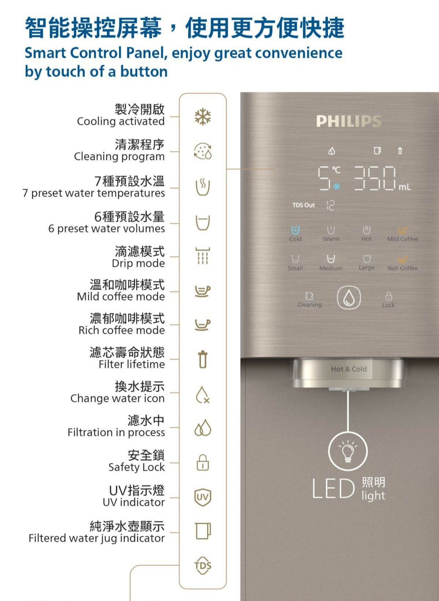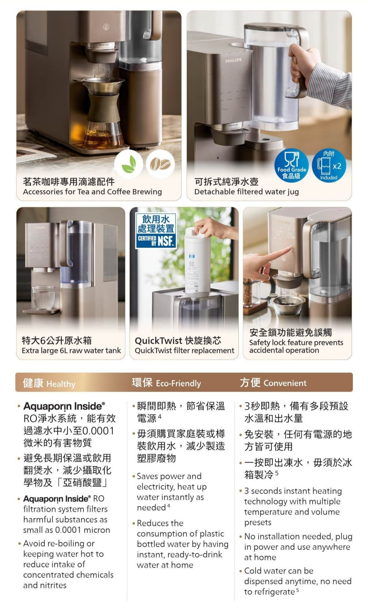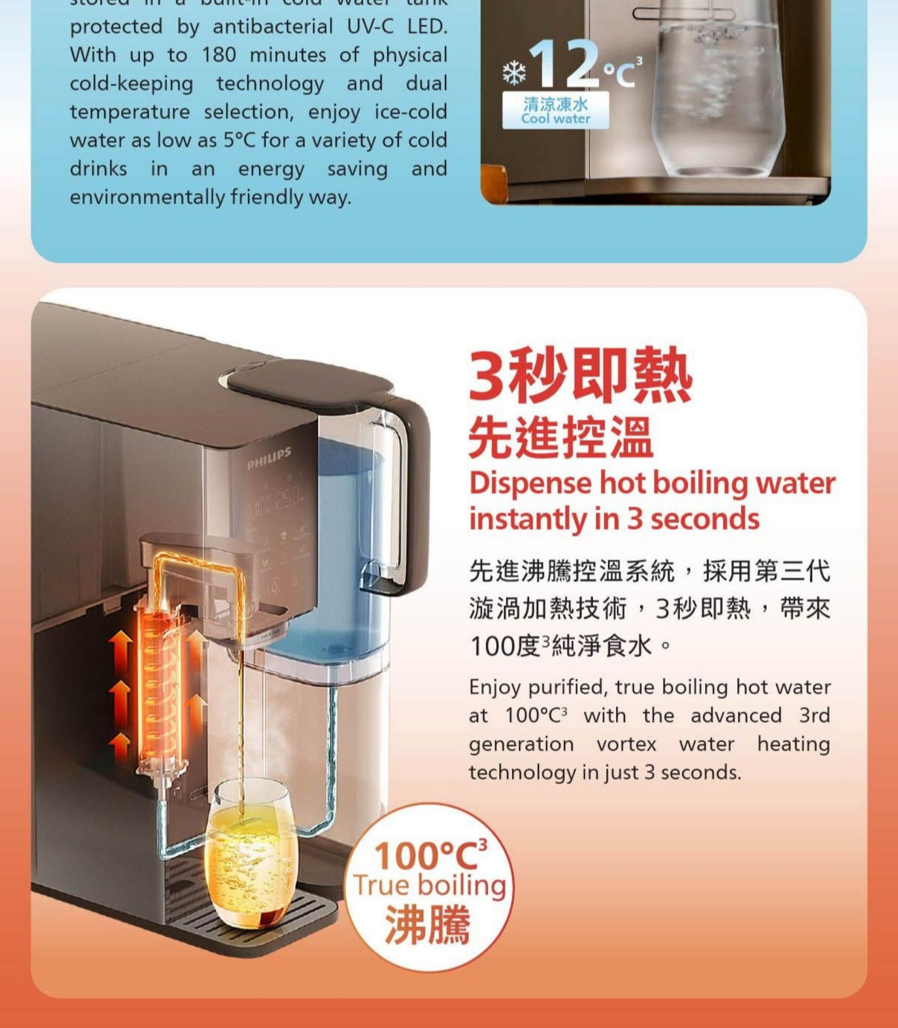 -即熱技術,幾秒鐘內提供新鮮熱水,可達100 °C沸騰