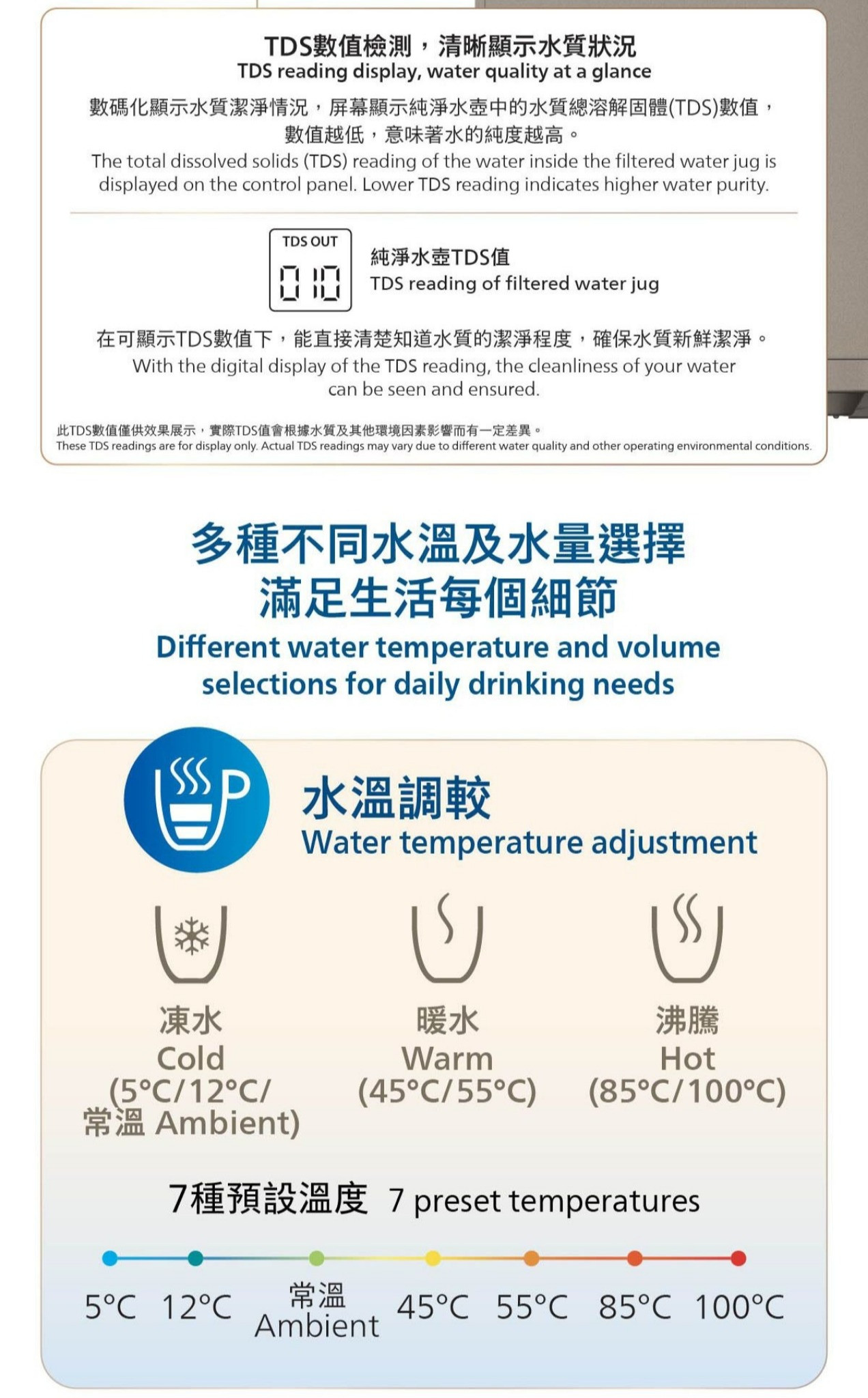 -預設水溫:5℃, 12℃, 常溫, 45℃ , 55℃, 85℃, 100℃