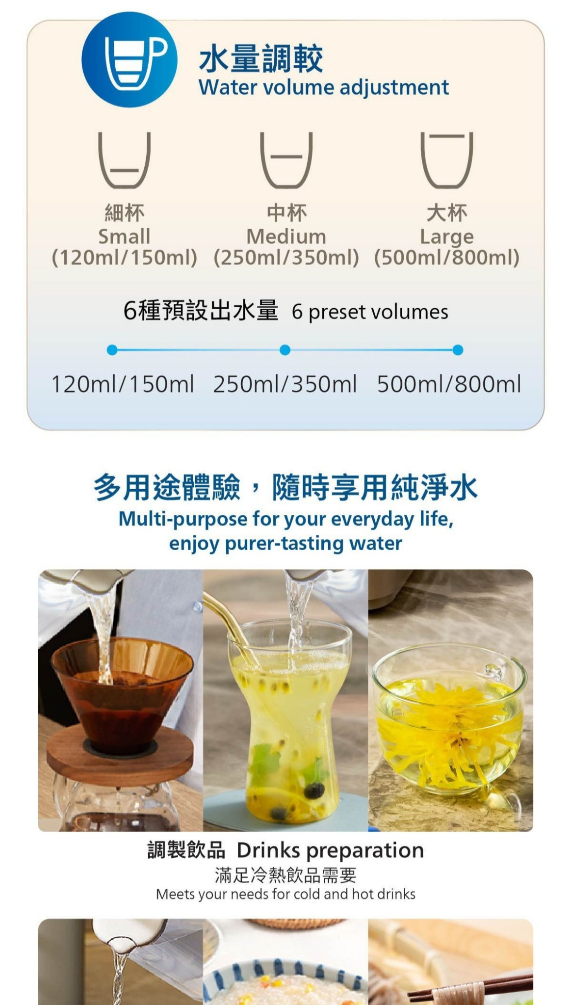 -預設出水量:120毫升, 150毫升, 250毫升, 350毫升, 500毫升, 800毫升